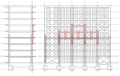 本工法は、眺望を妨げる斜めの筋交いを用いることなく補強間柱を配置することで、補強効果の調整が可能となり、幅広扁平梁と補強柱、補強間柱で構成した補強フレームを施工することで耐震性を向上させる耐震補強工法です。また、本工法は、条件を満たせば、既存の工法のように新設する補強フレームを基礎まで設置せず中間階での設置が可能となります。