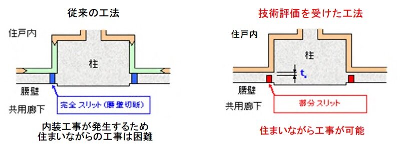 部分スリットを開放廊下側から施工するので、住戸側の壁には影響がありません。居住者 の負担を軽減し、住まいながら耐震補強工事ができます。