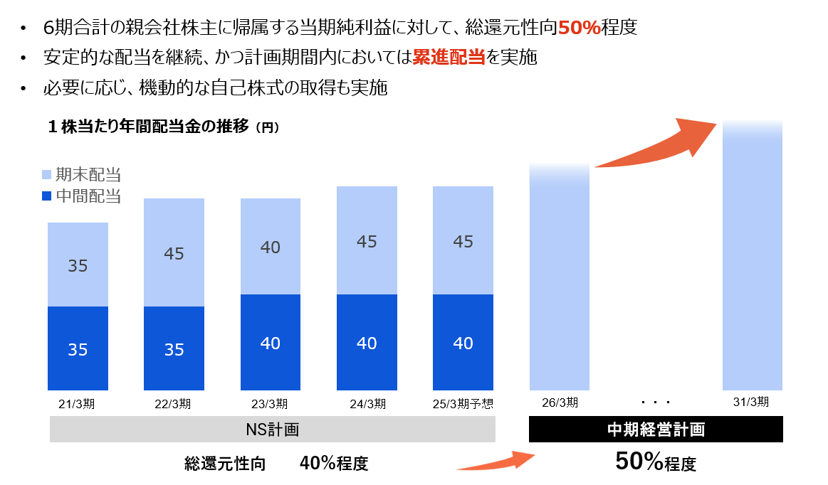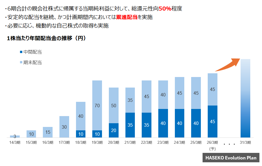 2031年3月期までの6か年を対象期間とする中期経営計画「HASEKO Evolution Plan」において、以下の内容を株主還元方針としております。