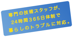 建物や設備の異常警報をオンラインで見守るだけではなく、専門の技術スタッフが常に待機して、「トイレの水が止まらない」「電気がつかない」「水が漏れている」といった暮らしのトラブルに関するご相談を24時間電話でお受けします。