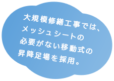 建物全体を足場や養生シートで覆う必要がないため、日照や風通し、眺望をさえぎることなく居住環境への影響を最小限に抑えることができます。