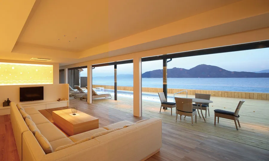 コバルトブルーの海と真っ白な砂浜のコントラストが美しいビーチ「白良浜」のほど近くに位置し、エントランスを入ると眼の前に田辺湾が広がる。11室すべてのお部屋からも海を一望できる抜群のロケーションです。当社エンジニアリング事業部が担当したインテリアは全室コンセプトが異なり、毎回新しい演出を楽しむことができます。露天風呂付き温泉大浴場も完備。豪快な舟盛など、地元の新鮮な海の幸を堪能できます。