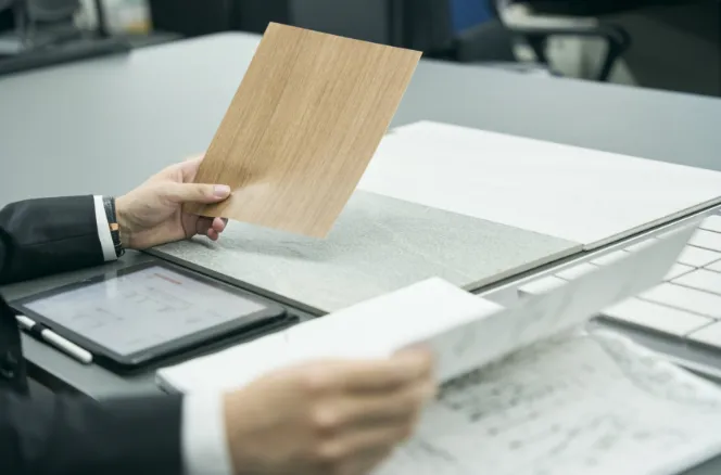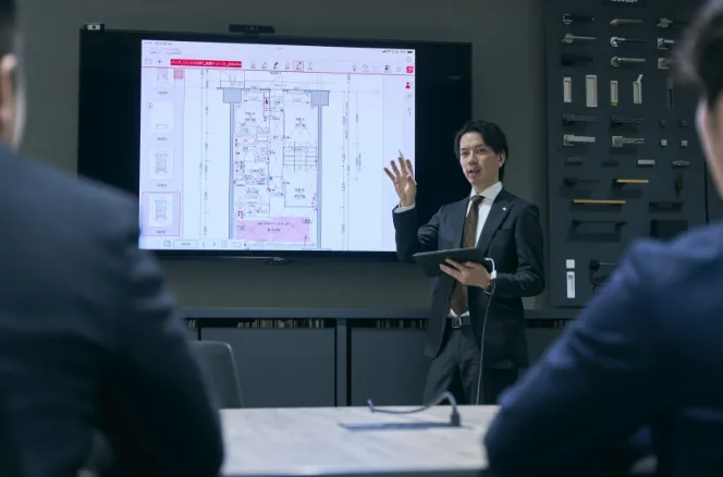 エントランスやラウンジなど共用部の内装デザインについて、専門チームと協力しながら、統一感や居心地のよさを追求する重要なミーティングです。