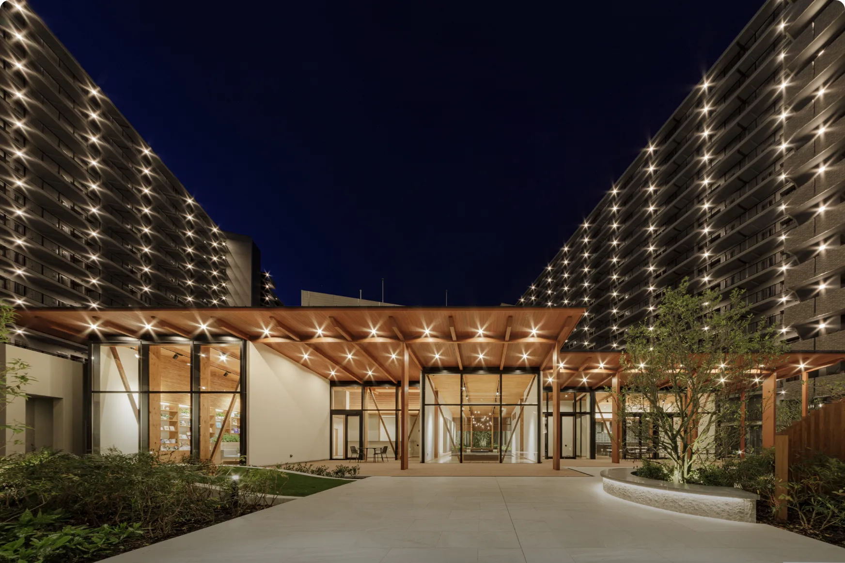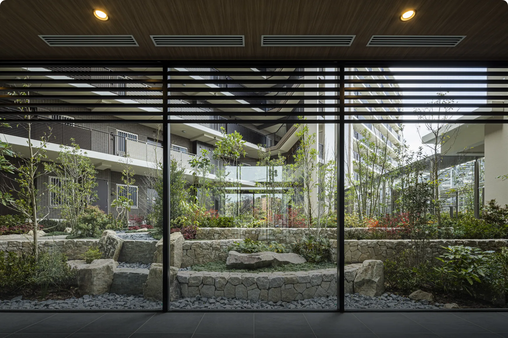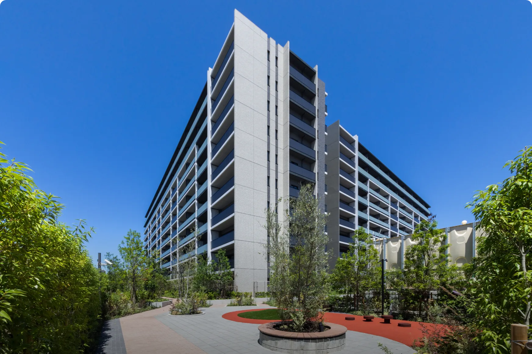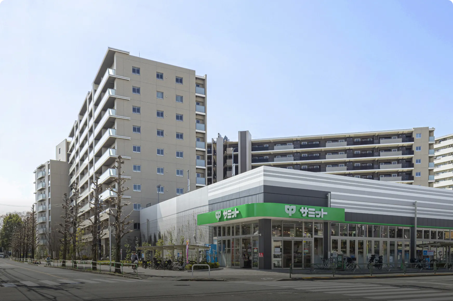 工場跡地という広大な敷地を活かし、「サミットストア」と一体となった街区として開発。「まちもり思想」を取り入れた6つのガーデンをデザイン。緑を通して交流を深め、コミュニティの活性化につながる屋外空間を実現。