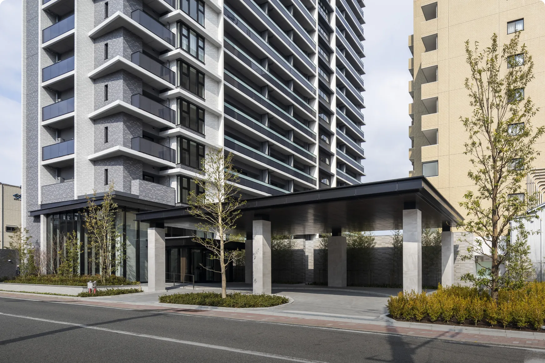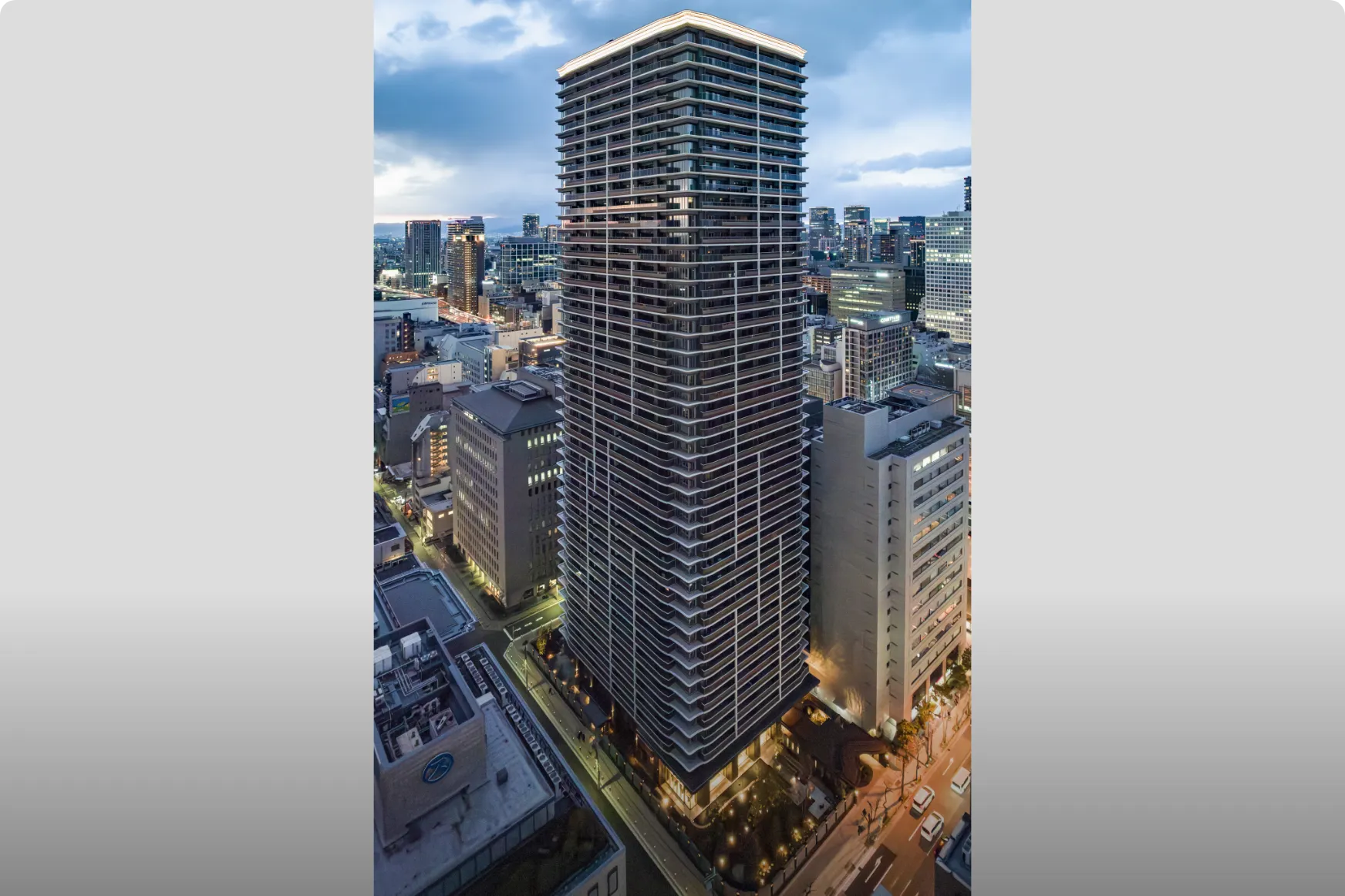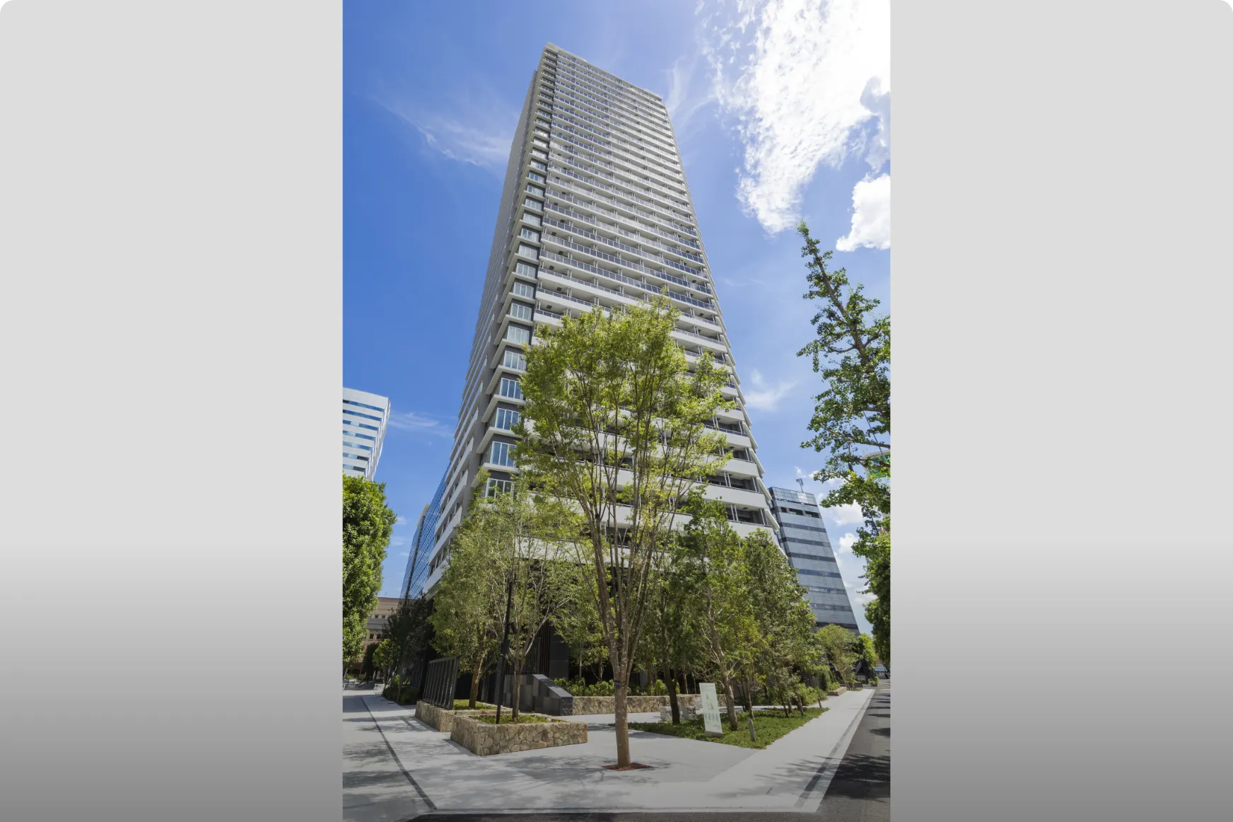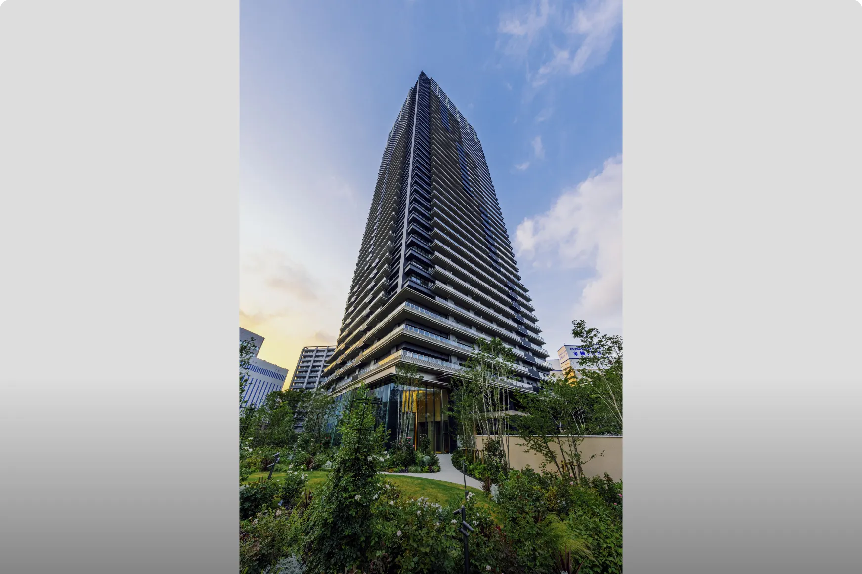 Osaka Metro「堺筋本町」駅徒歩1分の地上44階超高層タワーマンション。大通りに面した3方角地に位置しながら、格調高き塀と門で別世界を演出し、その中に四季折々の植栽が彩るプライベートガーデンを内包する。「おおさか優良緑化賞」奨励賞受賞。