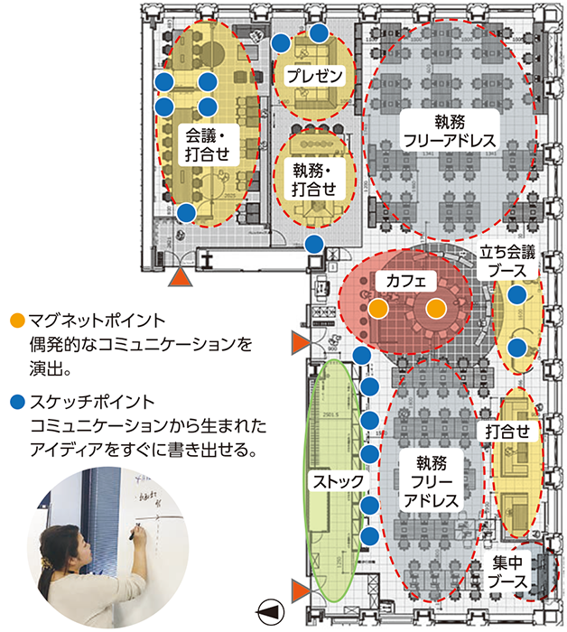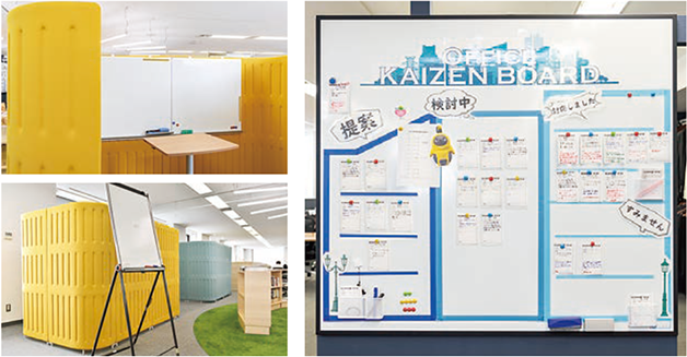 「価値創生部門」のオフィスは、「旅するオフィス」をコンセプトに環境整備が図られています。パーテーションのない空間に、毎日、違う場所に座ることで偶発を含めた多様なコミュニケーションを促す「完全フリーアドレス」を採用し、情報への常時アクセスを支援する「ワイヤレス環境」、そして「ペーパーレス環境」が整えられています。また、ストレスフリーを目指し、ガラス張りの会議室やソファ付きのデスク、カフェエリアを設置。どこでもアイディアを書きとめられるよう随所に書き消し可能の特殊塗装の壁を設けるなどオフィスには多くの工夫が施されています。
