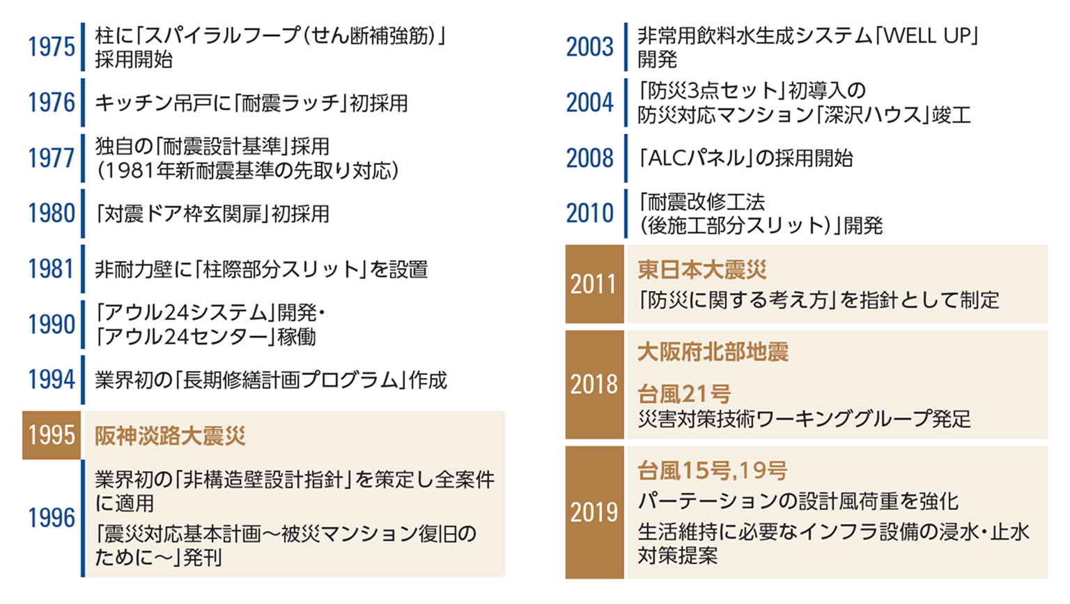 長谷工グループでは、国による制定に先駆けて、独自のマンション耐震設計基準を1977年に定めるなど、早期から自然災害への取り組みを進めてきました。長谷工グループのこれまでの取り組みを以下に示します。