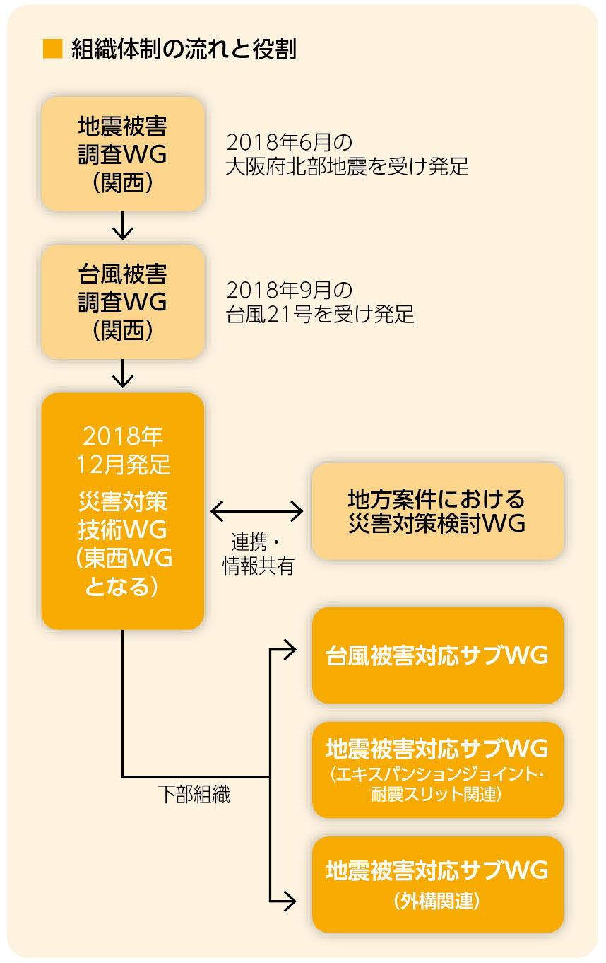 2018年は6月に大阪府北部地震、9月に台風21号が発生し、西日本を襲う大規模な災害が相次ぎました。これを受けて長谷工コーポレーション関西技術系メンバーにて、当社施工物件における被害状況の調査を実施するとともに、災害対応レベルを引き上げるべく、体制づくりに着手しました。調査内容がまとまった同年12月には、関西の調査メンバーに東京のメンバーも加え、設計・建設・技術推進の各部門が連携する「災害対策技術ワーキンググループ(以下、WG)」を発足させました。
