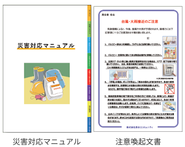 管理・運営では、防災意識の向上を図るべく、「災害対応マニュアル」を整備。事業主に提案の上、導入の際はハザードマップも掲載したマンションごとのマニュアルを作成し、管理組合や入居者への継続的なアドバイスとともに提供しています。
