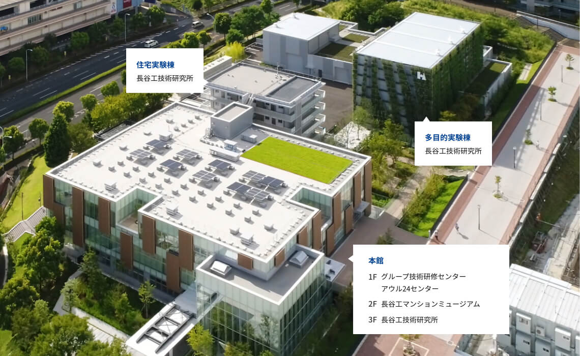 「長谷工テクニカルセンター」の中核となる施設が、「長谷工技術研究所」です。長谷工技術研究所では、建物の長寿命化や耐震性強化、CO2削減をはじめとする環境問題など、常に顧客や社会の新たなニーズに応えるべく、集合住宅に関する様々な性能実験や研究開発に挑戦しています。