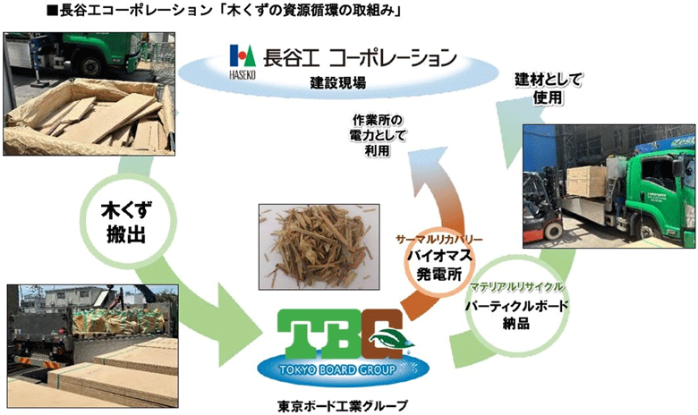 長谷工コーポレーションは、木くず中間処理会社の東京ボード工業と連携し、首都圏の建設現場で発生した木くずの回収と、パーティクルボード製品(板状の建築材料)の納入を同時に行う「木くずの資源循環の取り組み」を実施しています。回収した木くずはマテリアルリサイクルによりパーティクルボードへ再生するとともに、マテリアルリサイクルできない木くずは、バイオマス発電所でのサーマルリカバリーによって建設現場の電力として利用することで、木くずのリサイクル率100%を実現しています。