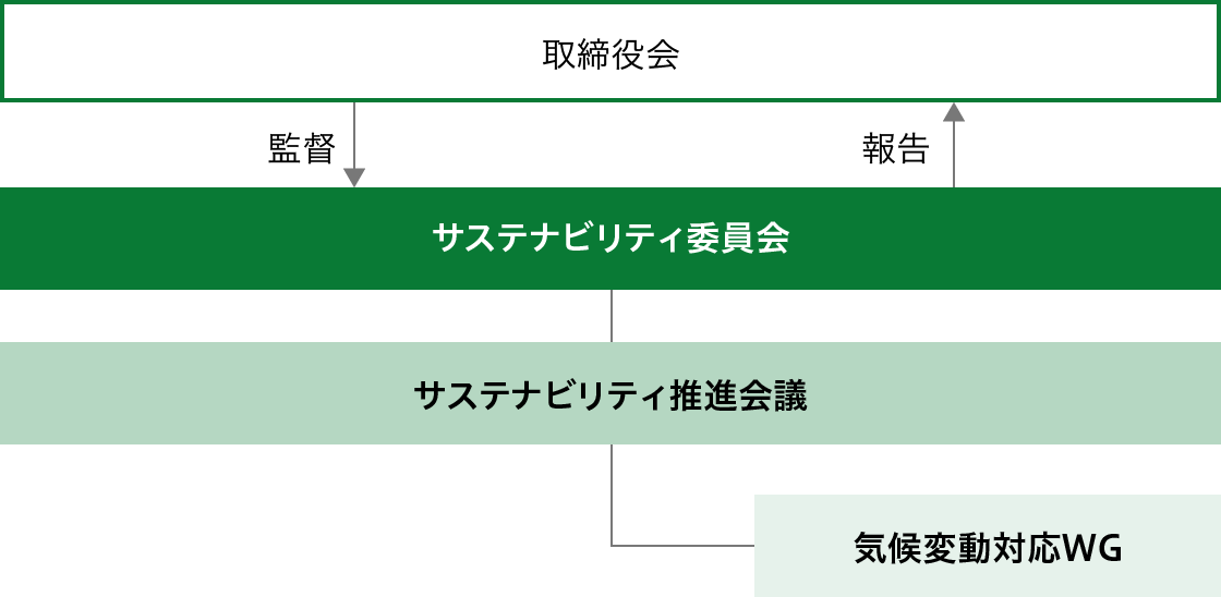 気候変動関連リスクについては、全社横断的なWGを設け、気候変動リスクの洗い出し、事業への影響度の分析を行っています。WGで分析されたリスクはサステナビリティ委員会で審議され取締役会に報告される体制となっています。