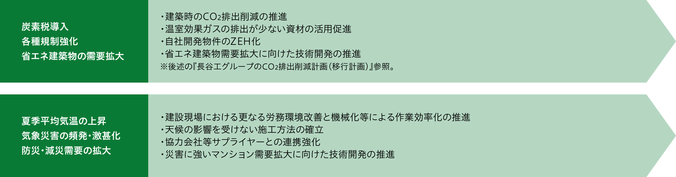 | 機会 | 防災・減災需要の拡大 | 気象災害の頻発・激甚化により、災害に強い住宅の需要が高まり、新築・リニューアル工事の受注機会拡大につながる可能性がある(建設事業)。 また、分譲や賃貸についても、災害に強い住宅が競合優位につながる可能性がある(不動産事業)。 |