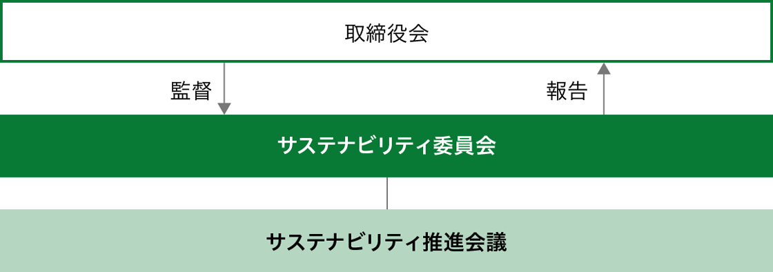 長谷工グループではサステナビリティの実現に向けて、下図のマネジメント体制の運用を通じて、サステナビリティの組織的な推進を図っています。取締役会の下部組織として、長谷工コーポレーション社長を委員長とする「サステナビリティ委員会」を設置しており、生物多様性への対応を含む、サステナビリティに関する方針、活動計画の審議・決定ならびに活動状況の把握・レビューを行っています。なお、サステナビリティ委員会での審議・報告事項については、取締役会に報告され監督される体制となっており、重要な事項については取締役会に付議し審議の上決定しています。サステナビリティ委員会で取りまとめられた生物多様性関連の経営課題は、事業戦略や投資戦略等、長谷工グループの経営戦略の検討時に考慮していきます。また、委員会の下部組織として、「サステナビリティ推進会議」を設置し、生物多様性の取り組みなども含め、グループ全体でのサステナビリティの推進・浸透に取り組んでいます。