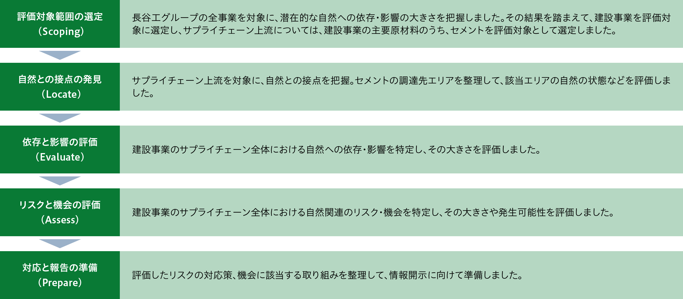 長谷工グループは、自社事業における自然関連の依存・影響、リスク・機会の評価を実施しました。評価作業は、TNFDが推奨する「LEAPアプローチ」に沿って進めました。まず、Scoping(評価対象の選定)にて、評価対象とする範囲を選定した後、Locate(自然との接点の発見)、Evaluate(依存・影響の評価)、Assess(リスク・機会の評価)、Prepare(対応策の検討)を実施しました。