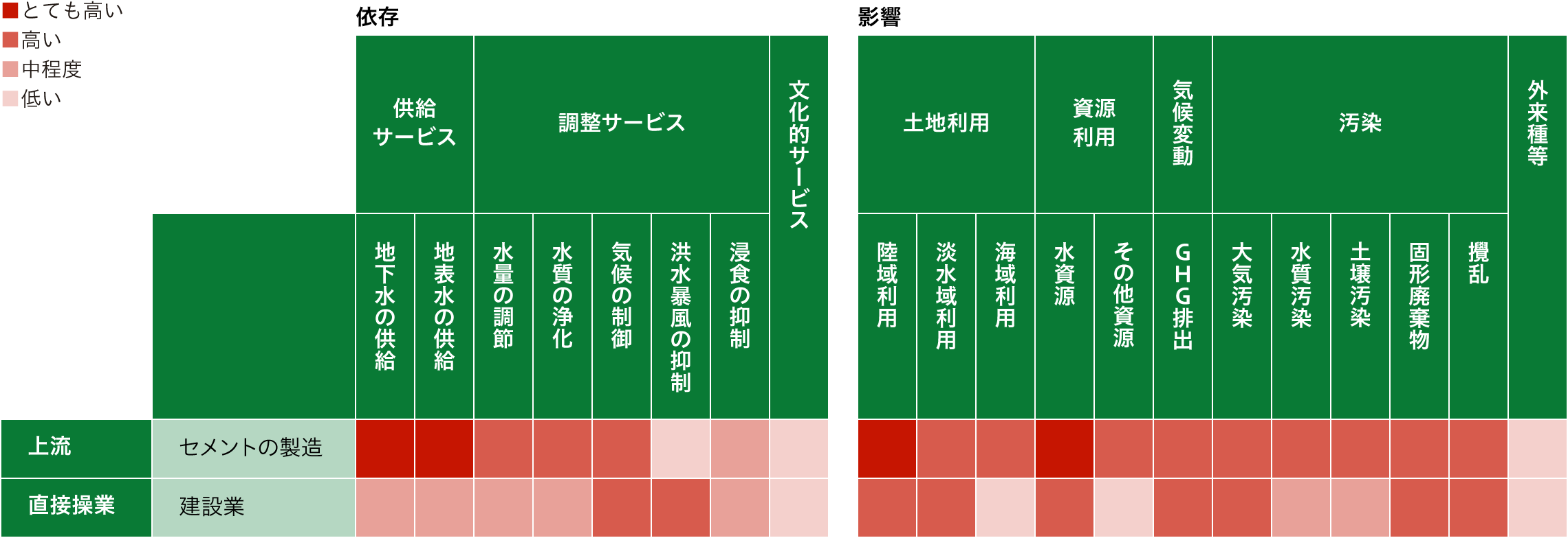 | 保全重要度 | 一部の石灰石鉱山、セメント調達先は、保護地域及びKBA(Key Biodiversity Area)と近接している可能性がある。 |