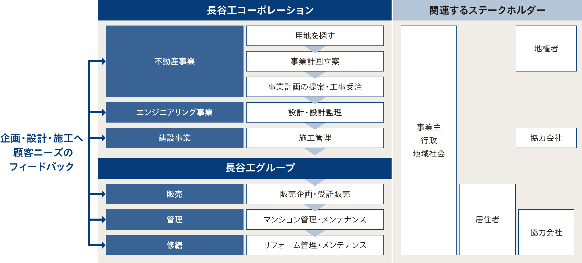 長谷工グループのマンション事業は、土地持込による特命受注という独自のビジネスモデルと、販売・管理・修繕などを通して得た顧客ニーズをフィードバックして、事業提案、商品企画、設計・施工品質に活かすというグループの総合力に強みがあります。