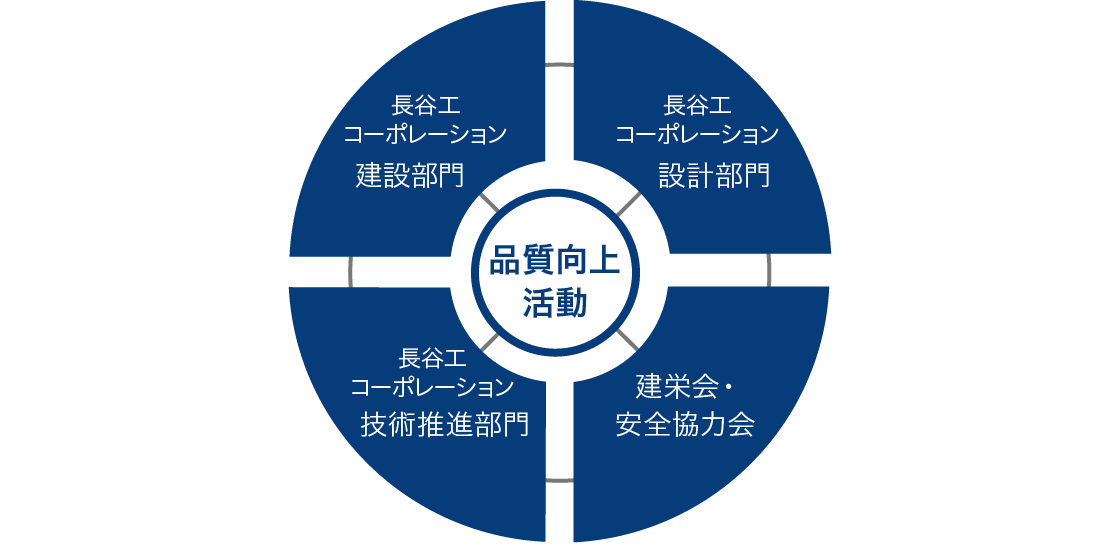 長谷工コーポレーションでは、設計部門、建設部門、技術推進部門に加えて、約300の主力協力会社からなる組織「建栄会」が「四位一体」となって、精度の高いマンションづくりを担っています。この協力関係は四半世紀以上にわたって続いており、固い絆で結ばれた品質管理体制は他社にはない当社独自の強みとなっています。