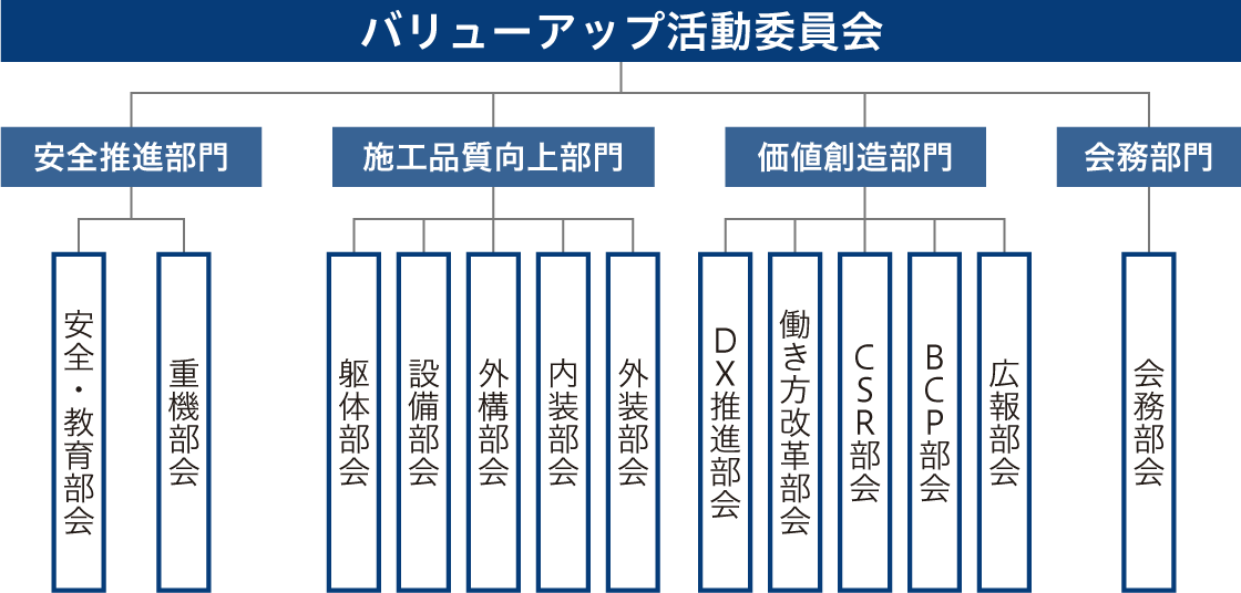 2021年度以降は、建設作業所でのアナログ情報のデジタル化を更に進め、プロセス自体もデジタルへ移行することを目指した活動を推進しています。また、自然災害対応等を担当する「BCP部会」を新設し従来からの「CSR部会」において環境保全活動やSDGs‧脱炭素等への対応を積極的に推進しています。