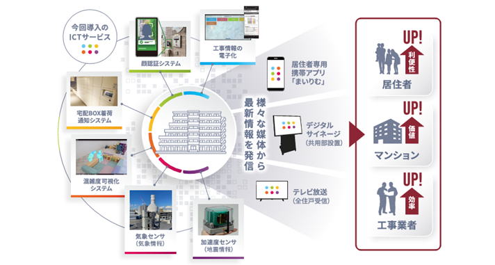 長谷工リフォームが大規模修繕工事を実施するタイミングで導入し、居住者専用アプリ「まいりむ」※やデジタルサイネージ等と連動させることで、最新の工事情報や施設の利用状況などを提供します。