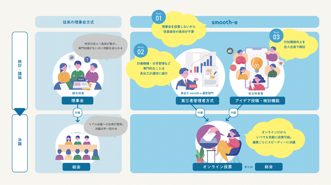 理事会運営や輪番制の役員責任の負担に悩んでいる分譲マンションの管理組合様に向けたサービスです。従来の管理受託業務に加え、管理者管理方式(理事会を廃止)を採用した上で、管理会社に管理組合運営をおまかせいただきます。また区分所有者同士で意見交換ができるWebツールをご利用いただき、マンション内でのより良い合意形成を実現しながらマンションの付加価値向上を目指す管理組合をサポートします。(特許出願済、商標登録済)長谷工管理会社グループ※でサービスを提供しており、2021年8月のサービス提供開始以来、導入件数は131件(10,789⼾)となりました。(2025年3月現在)