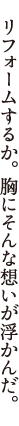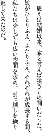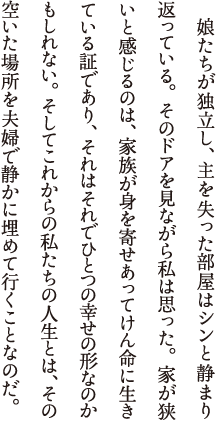 珍しく早く帰宅した夜だった。夕食後妻は台所で洗い物をし、私はリビングでウイスキーを飲んでいた。ふいにその時「あ、家が広い」と感じた。人生で初めて味わう感覚だった。思えば結婚以来、家と言えば狭さとの闘いだった。娘がひとりふえ、ふたりふえ、それぞれが成長する間、私たちは少しでも広い空間を求め、引っ越しを繰り返して来たのだ。娘たちが独立し、主を失った部屋はシンと静まり返っている。そのドアを見ながら私は思った。家が狭いと感じるのは、家族が身を寄せあってけん命に生きている証であり、それはそれでひとつの幸せの形なのかもしれない。そしてこれからの私たちの人生とは、その空いた場所を夫婦で静かに埋めて行くことなのだ。リフォームするか。胸にそんな想いが浮かんだ。