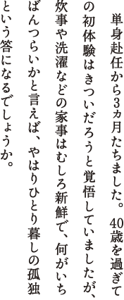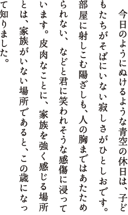 こずえ様。単身赴任から3ヵ月たちました。40歳を過ぎての初体験はきついだろうと覚悟していましたが、炊事や洗濯などの家事はむしろ新鮮で、何がいちばんつらいかと言えば、やはりひとり暮しの孤独という答になるでしょうか。今日のようにぬけるような青空の休日は、子どもたちがそばにいない寂しさがひとしおです。部屋に射しこむ陽ざしも、人の胸まではあたためられない、などと君に笑われそうな感傷に浸っています。皮肉なことに、家族を強く感じる場所とは、家族がいない場所であると、この歳になって知りました。来週初めての帰京です。なんと待ち遠しいことでしょう。今週の僕は、おそらく世界で一番長い一週間を味わう男になりそうです。