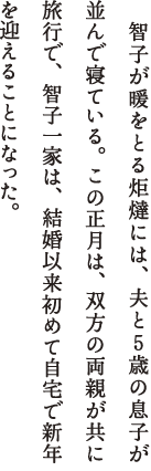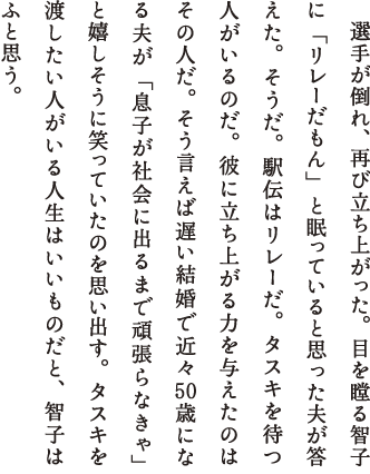 テレビにはふらふらになった選手が映っていた。目はうつろで既に走れる状態ではない。リタイアかな、と智子はつぶやいた。智子が暖をとる炬燵には、夫と5歳の息子が並んで寝ている。この正月は、双方の両親が共に旅行で、智子一家は、結婚以来初めて自宅で新年を迎えることになった。選手が倒れ、再び立ち上がった。目を瞠る智子に「リレーだもん」と眠っていると思った夫が答えた。そうだ。駅伝はリレーだ。タスキを待つ人がいるのだ。彼に立ち上がる力を与えたのはその人だ。そう言えば遅い結婚で近々50歳になる夫が「息子が社会に出るまで頑張らなきゃ」と嬉しそうに笑っていたのを思い出す。タスキを渡したい人がいる人生はいいものだと、智子はふと思う。
