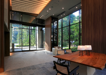 「もともと敷地内には、たくさんの樹木が生い茂っていました。環境への配慮、そしてその土地の記憶を引き継ぐため、樹木医の診断のもとできるだけ樹木を残し、結果として43本の樹木を保存しました。例えばマンションの車寄せには、ケヤキの既存樹をそのまま活かした高さ約19mのシンボルツリーを設置するなどしています。また、やむなく伐採した樹木も、故・坂本龍一さんが創立し現在は建築家の隈研吾さんが代表を務める森林保全団体とタッグを組んで、エントランスホールのテーブルや入居者にプレゼントするフォトフレームとしてアップサイクルしました。」