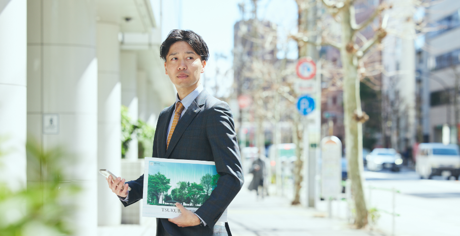 日本最大クラスの学園都市・つくば。国内屈指の研究機関が集積している自然豊かなこのエリアで、敷地面積12,000平米以上の大規模マンション「TSUKUBA TERRACE」の開発計画が立ち上がりました。つくばの街に新たな息吹を吹き込むべく、合同事業主や自治体、地域の街づくり会社、地元小学校など、さまざまな関係者を巻き込みながら進行されたプロジェクト。 このプロジェクトのデベロッパー担当として先頭に立ったのが、総合地所の儀間駿也。今回は、儀間が手掛けた、この「TSUKUBA TERRACE」のプロジェクトストーリーをご紹介します。