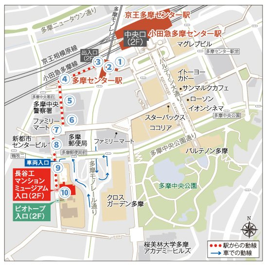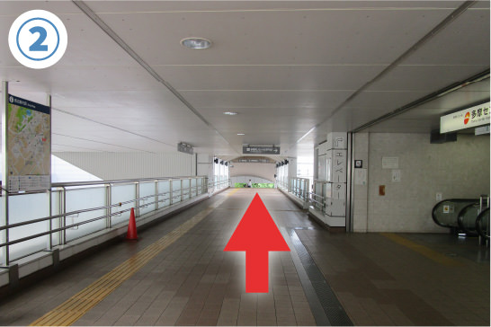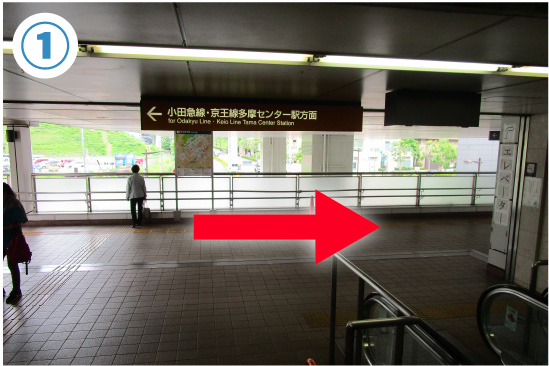 ➀改札を出て階段・エスカレーターを下りたら、右に曲がります(小田急線・京王線多摩センター駅方面ではありません)。