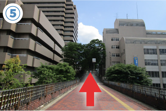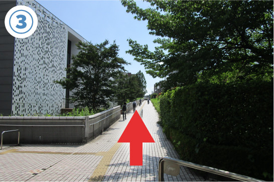 ③ペデストリアンデッキに出たら、1階には下りずに斜め左方向の道を進みます(左手には多摩メディカルモールが見えます)。