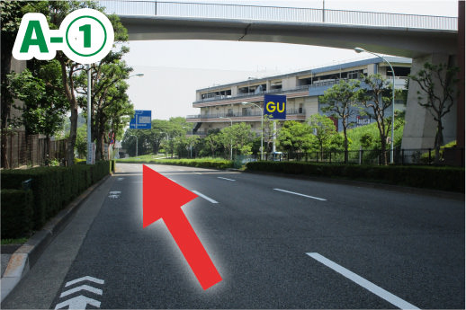 ②右手に「GU」の看板が見えたら左側車線に入ります。