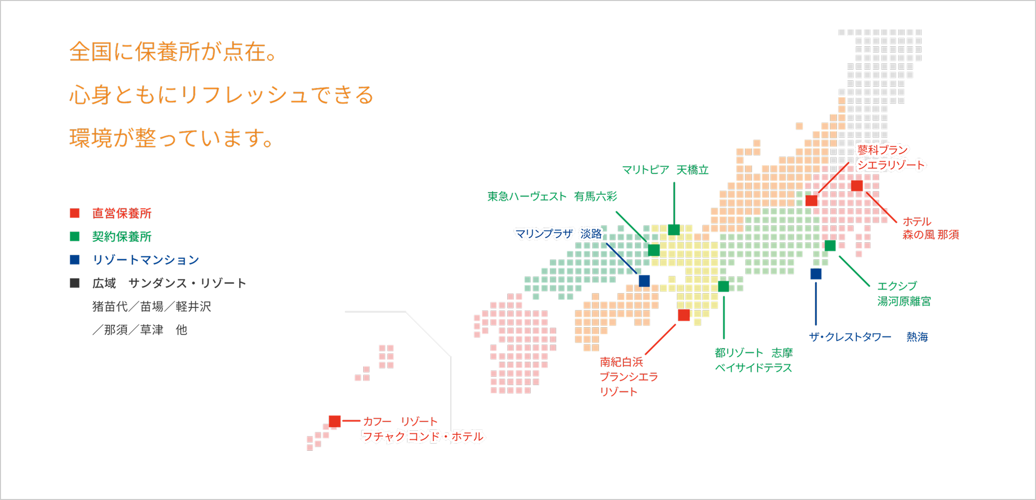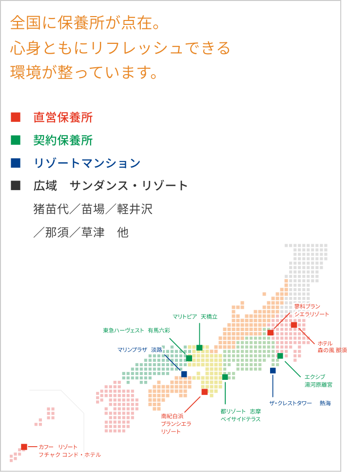 - 長野県の蓼科と和歌山県の白浜に直営保養所を持ち、その他に熱海と淡路島にリゾートマンションがあり、さらに契約保養所の利用が可能です。心身ともにリフレッシュできる環境が整っています。