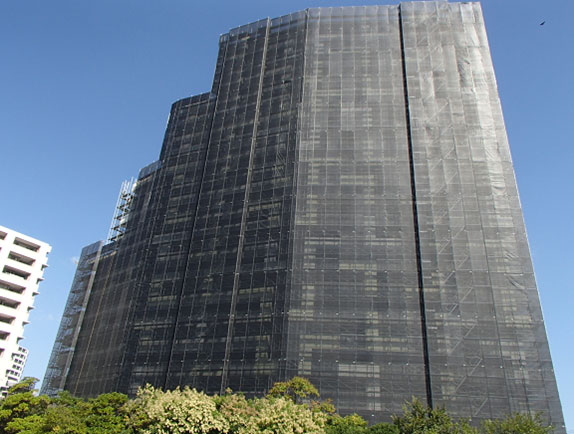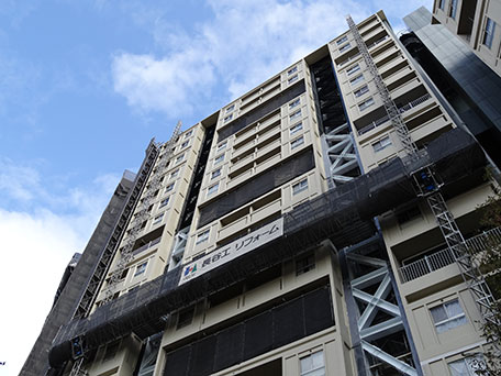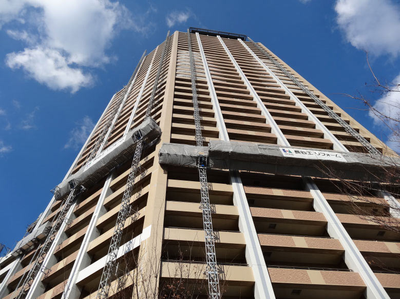 設置が簡単で作業性・安全性が向上。居住者様・環境に優しい移動昇降式足場です。最近、ビルやマンションの外壁の修繕工事で採用されています。
