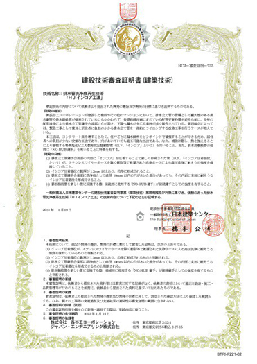 長谷工では、新しい排水立管の再生技術【 HJインコア工法 】を開発し、10,000戸以上の施工実績をもとに建設技術審査証明(BCJ-審査証明-233:2017年1月19日)を取得しました。