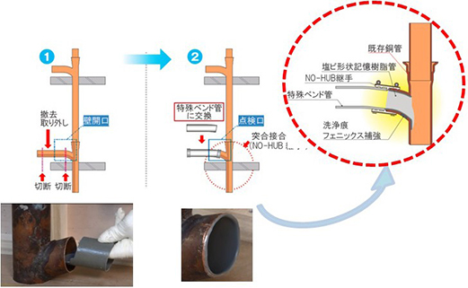 立て管と横引管との合流部の壁面に点検口を設けて作業します。コンクリートのハツリ工事がなく、既設配管の切断・研磨時に音が発生する程度で工事ができます。