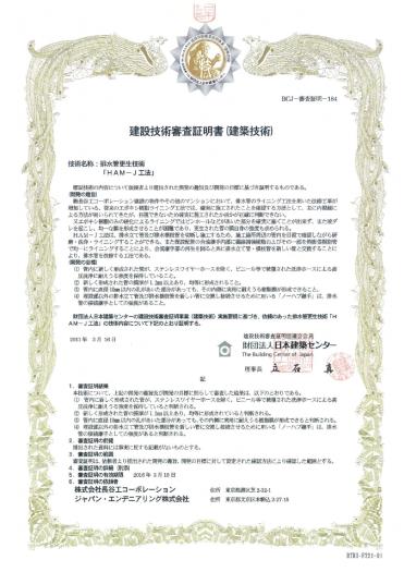 日本建築センターの建設技術審査証明書(BCJ-審査証明-184)を2011年3月16日取得し2016年1月25日に更新をしております。