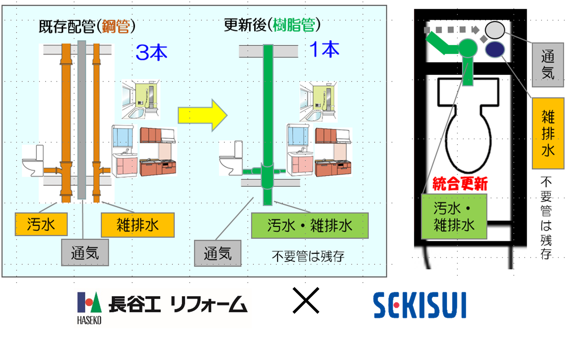 3本の既存立管から1本のみを鋼管から耐火性硬質ポリ塩化ビニル管(樹脂管)に更新するという立管統合更新工事を実現する技術です。これまで改修工事では、特殊排水継手採用による立管統合は技術的に不可能という定説を覆し、実現しました。