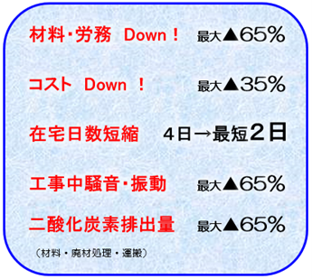 工事に伴う騒音・振動や材料製造・運搬に伴うCo2排出量も各々最大▲65%削減することが可能となりました。