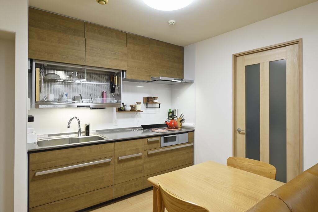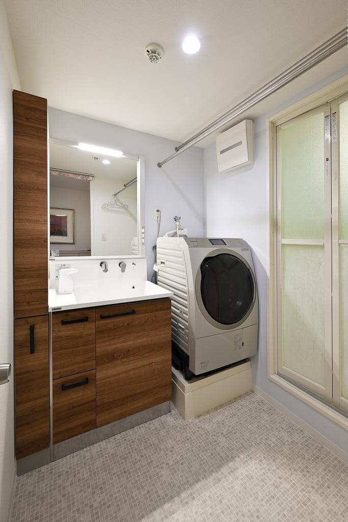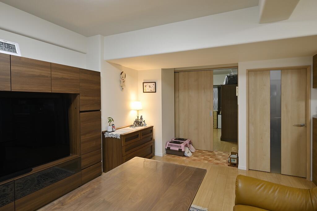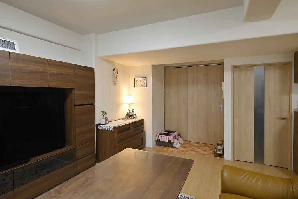 またケージを含むペット用品を置けるスペースを設けたいというもう一つのご要望を叶えるために、リビング隣の洋室の物入れを取り払ってそこをペット専用のスペースとして再生。家族が過ごすリビングの一角でお昼寝や食事ができる専用スペースを叶えました。床はタイル調のクッションフロアに変えたことで掃除もしやすくなり、デザイン的にもリビングとメリハリをつけることができました。以前は仕切られていたペットスペースと洋室の間には引き戸を採用。引き戸を開けておけばワンちゃんをのびのびと遊ばせる回遊性が生まれ、風通しも良くなって家族もワンちゃんも快適に過ごすことができます。
