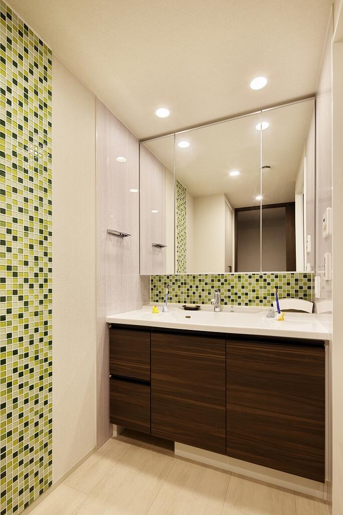 寝室や玄関には、上質なデザインの調湿効果に優れたタイルを選ばれ、機能面も高めました。キッチンのカップボードや洗面室では、遊び心のある鮮やかなモザイクタイルでカラフルな雰囲気を演出し、楽しんでおられます。