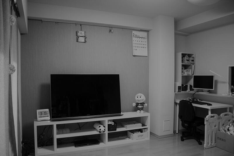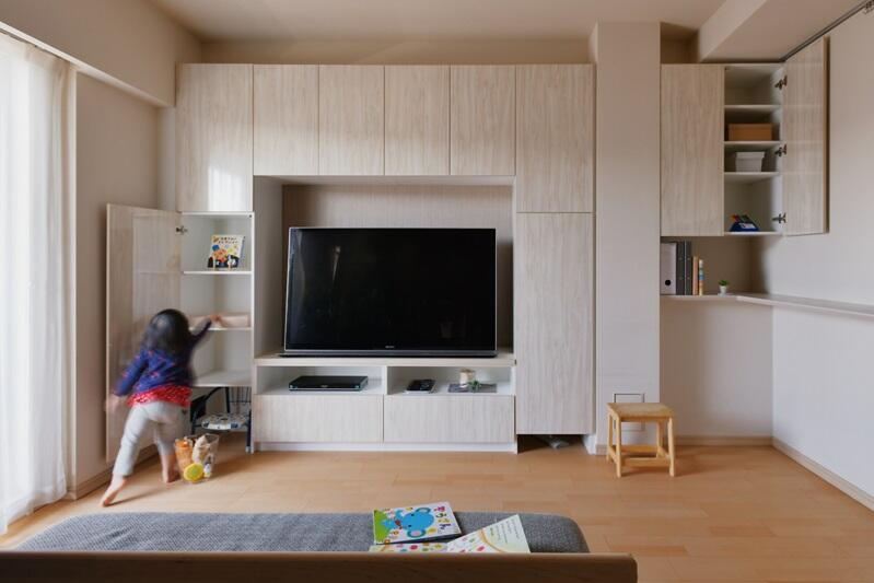 ①-1【リビングボード(右手フロート収納は除く):約 28.7万円(税込)(取付設置費 別途)】壁一面をTVボードを兼ねた収納に。梁や柱と一体化させ、空間をすっきりと見せます。