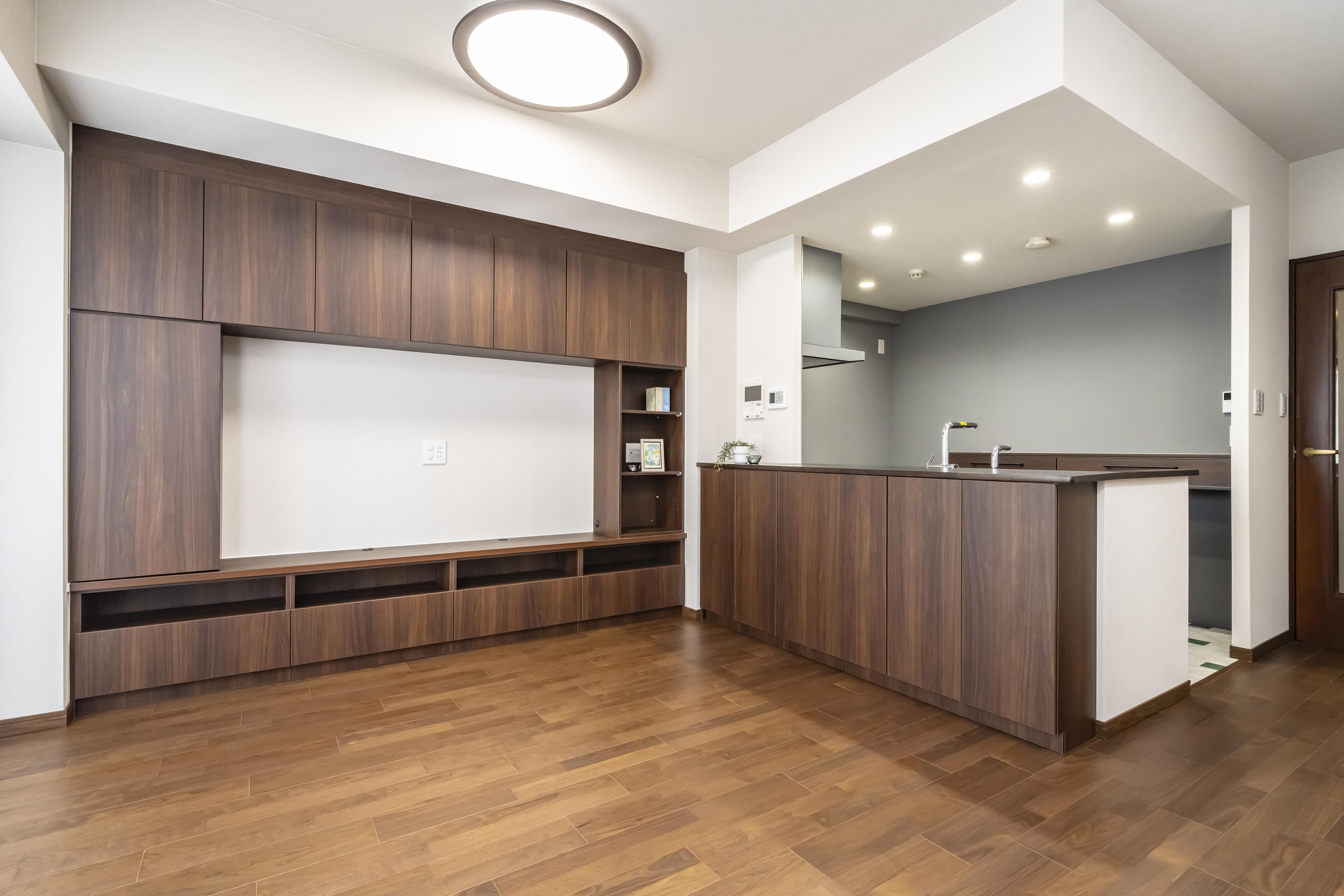 ④【リビングボード:約 42.9万円(税込)+カウンター下収納:約14.3万円(税込)(取付設置費 別途)】床、建具、キッチンに合わせたカラーで統一感のあるリビングダイニングスペースに。