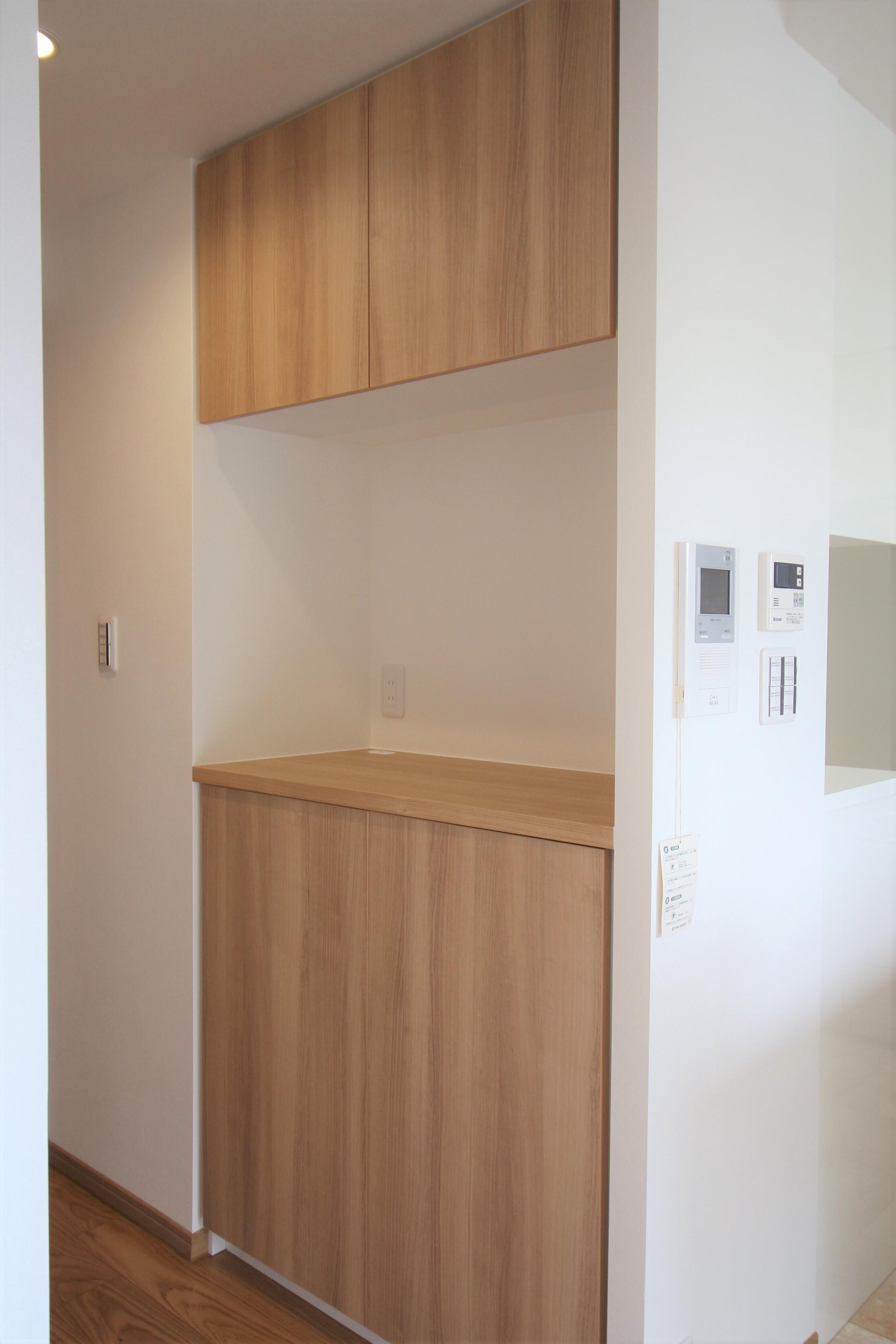 ⑥【カウンター下収納:約 19.8万円(税込)(取付設置費別途)】キャビネット内にコンセントを取り出し、電話台代わりに。配線が目立たずすっきり見せることができます。