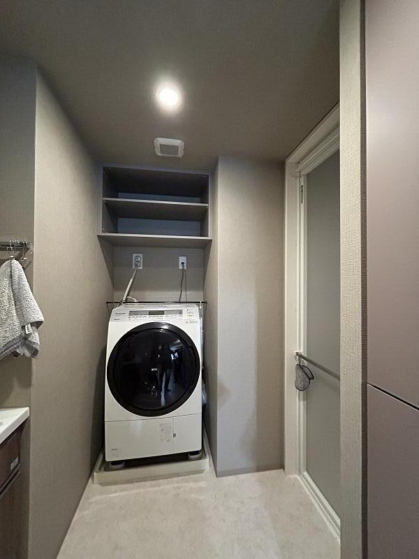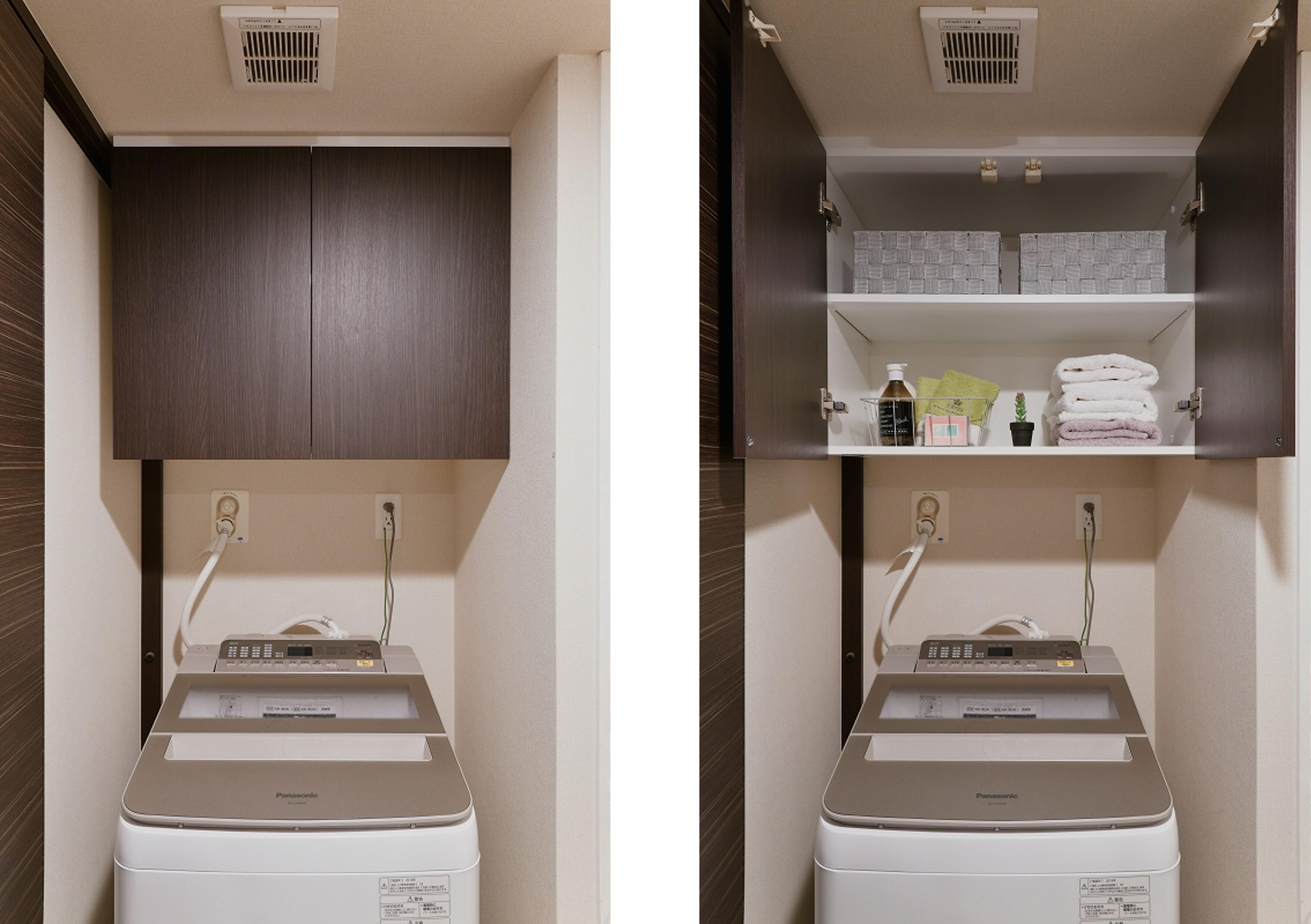 ④【吊戸棚:約 3.3万円(税込)(取付設置費 別途)】洗濯機上のスペースを活用しない手はありません。扉は洗面室のドアに合わせて『木目ダークマット』に。