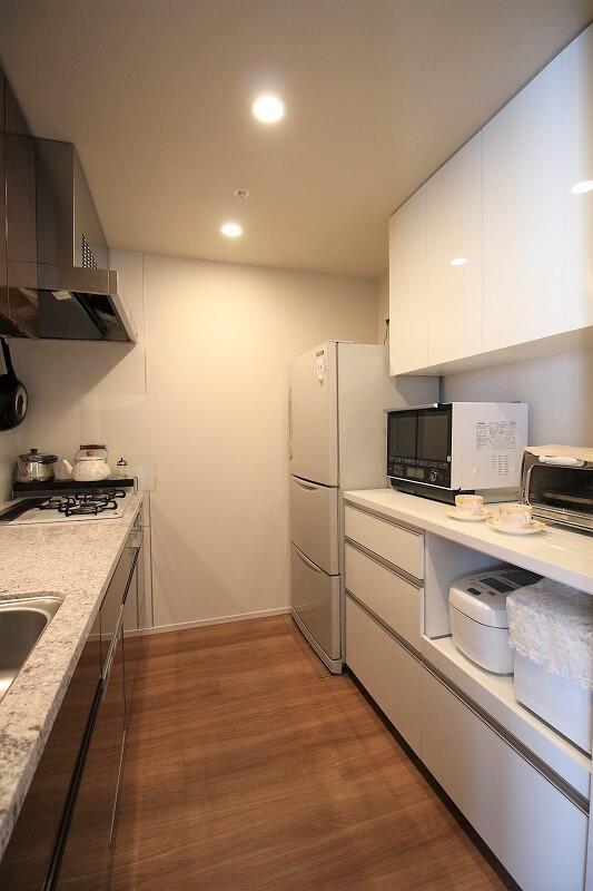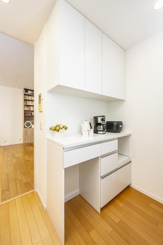 ③【カップボード:約 25.8万円(税込)(取付設置費 別途)】作業スペース確保のため、下台の奥行はたっぷり60センチ。艶のあるホワイトカラーが清潔な印象です。