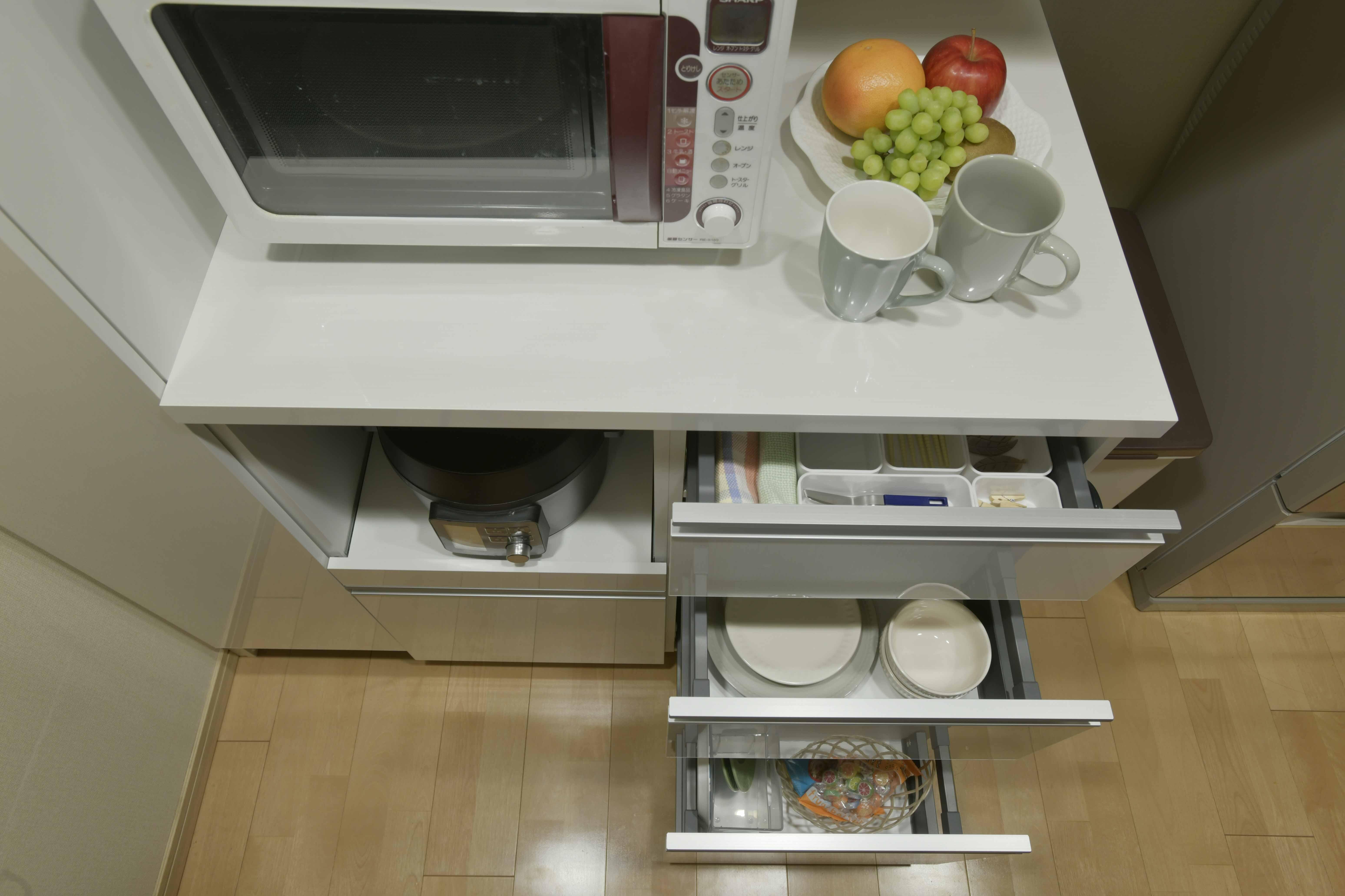 ①-3 小さなものも大きなものも収納できるよう、カップボードは高さの異なる3段引き出しとなっています。