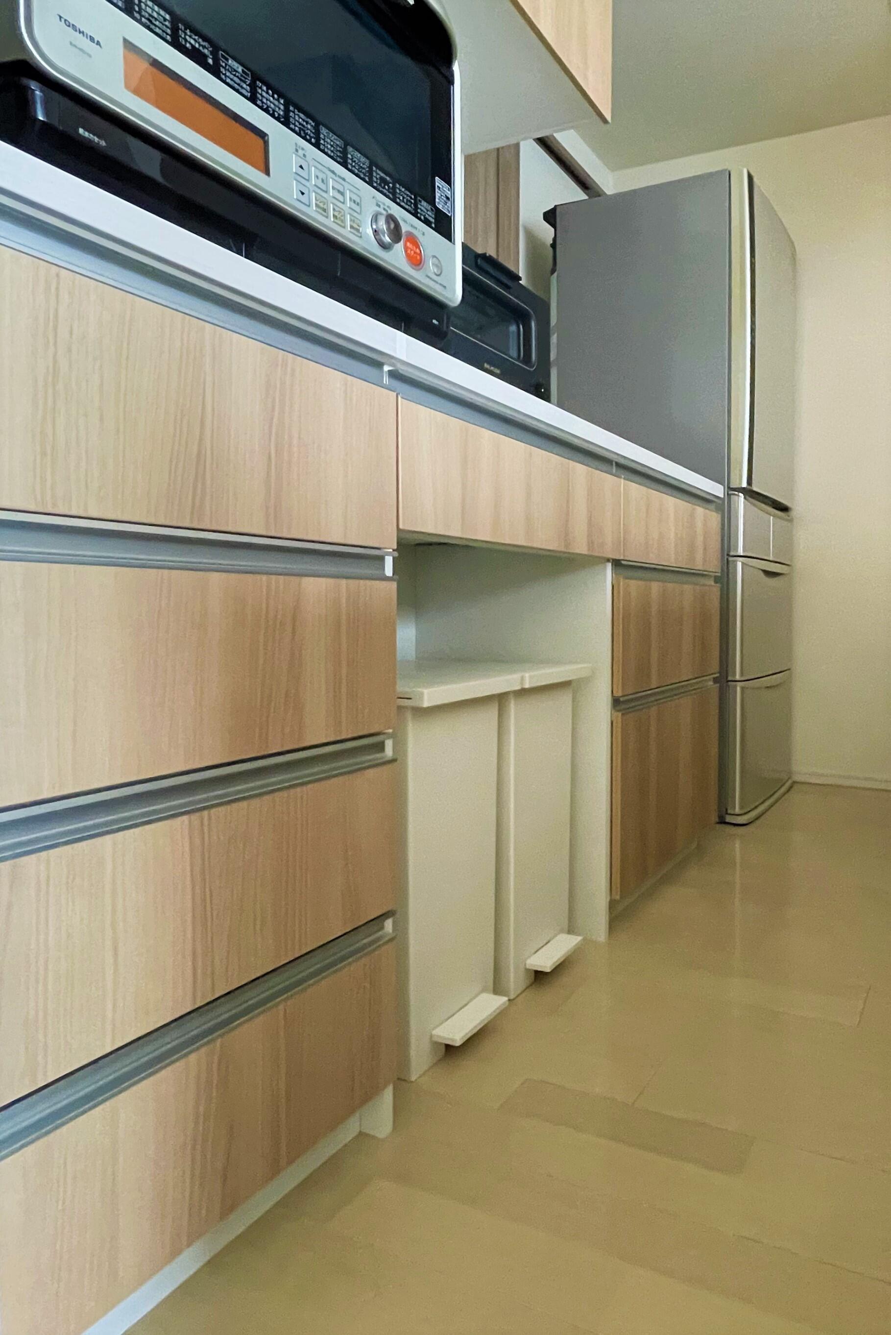 ②-3 オープンスペースのあるデザインにすれば、ゴミ箱を収めて足元をスッキリさせられます。