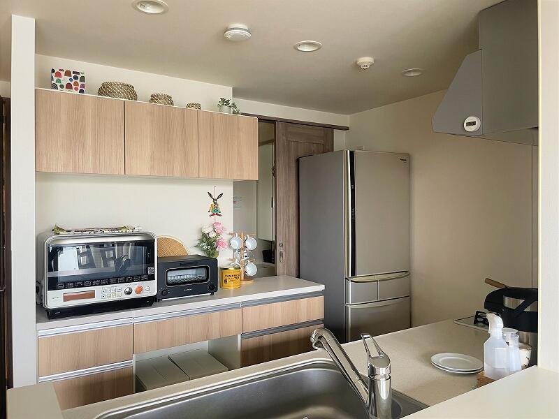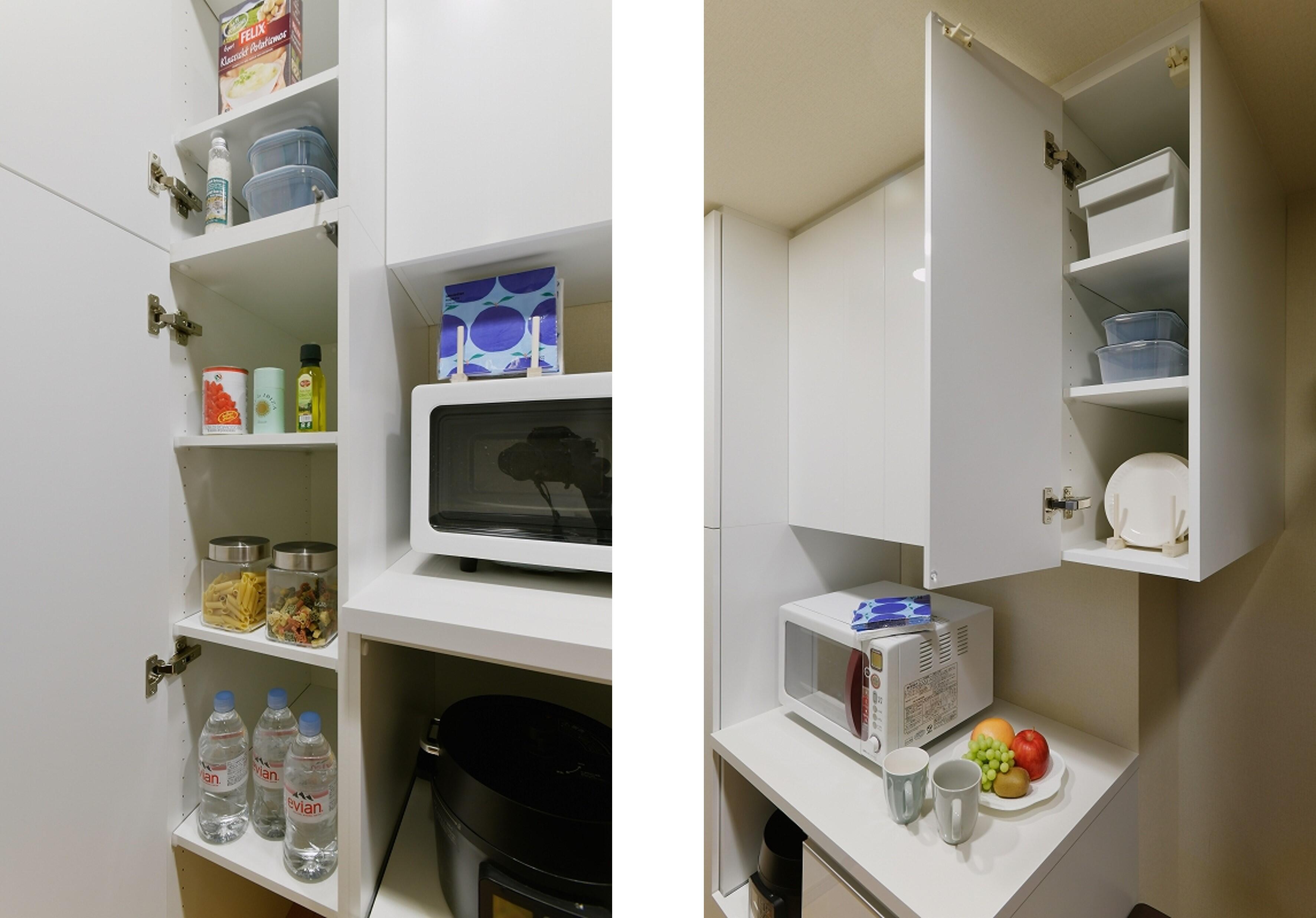 ①-1【カップボード:約 27.5万円(税込)(取付設置費 別途)】小柄な奥様の手が届く範囲で収納を増やすため、トールタイプのキャビネットと組み合わせました。
